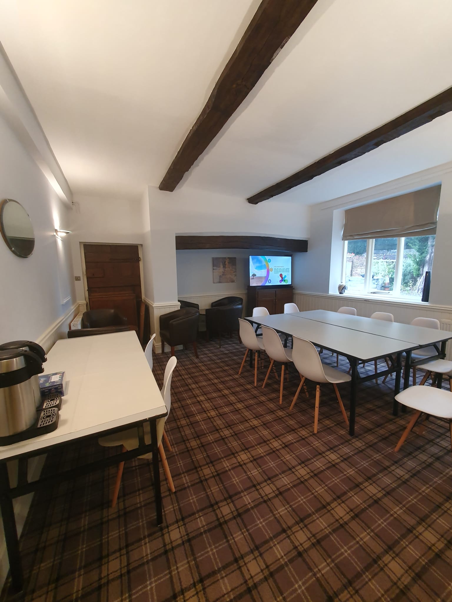 Looking for a unique and welcoming venue for your next meeting or workshop? The Manor Cheadle has a warm and cosy meeting room is located in a beautiful 18th-century building full of character, complete with original beams and charming details. The space is ideal for small groups and team sessions, with a large screen for presentations and flexible layouts to suit your needs.